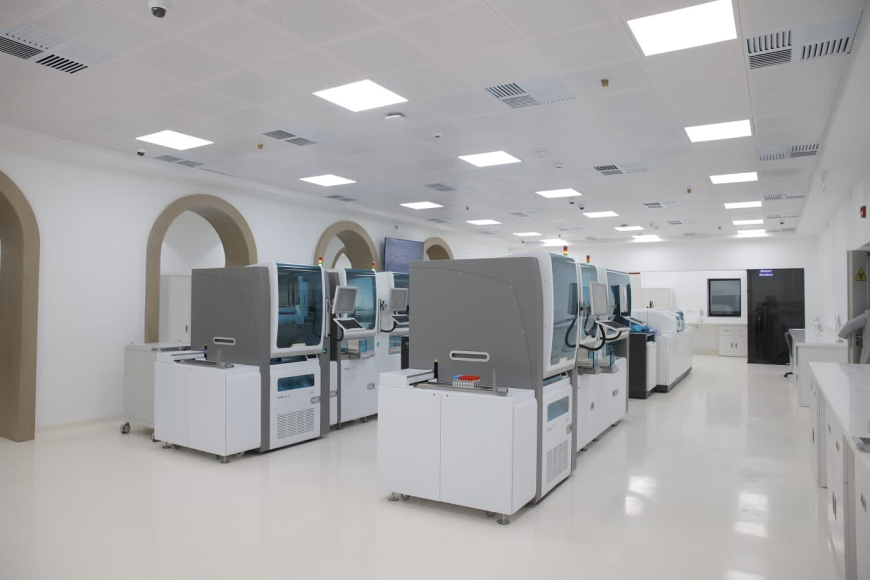 يغطي نظام التشغيل الآلي المتطور للمعمل نطاقًا واسعًا من الاختبارات الطبية المعملية، بما في ذلك الكيمياء الإكلينيكية، واختبارات المناعة، وتخثّر الدم، وتحاليل البول، وأمراض الدم. ويقوم المعمل بتنفيذ كافة الاختبارات الطبية بشكل آلي بالكامل، بما في ذلك نقل العينات وتنفيذ مراحل ما قبل وما بعد التحاليل، وبالنظر للدورة الكاملة لكل اختبار، ندرك أن المعمل الرئيسي المطور يقلل بشكل كبير معدلات الأخطاء البشرية، لا سيما في مراحل ما قبل التحليل، والتي تشهد وقوع أكثر من 60% من الأخطاء المعملية المعتادة.