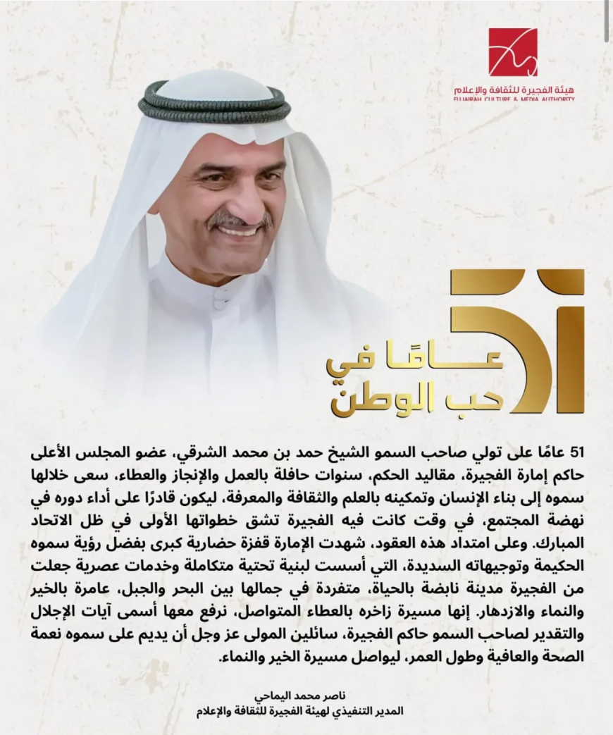 تحتفل الفجيرة بالذكرى الـ51 لتولي صاحب السمو الشيخ حمد بن محمد الشرقي،عضو المجلس الأعلى، حاكم الفجيرة، مقاليد الحكم في الإمارة، ويمثلهذا اليوم محطة فخر وولاء يستذكر فيها أبناء الإمارة والإمارات مسيرةسموه
